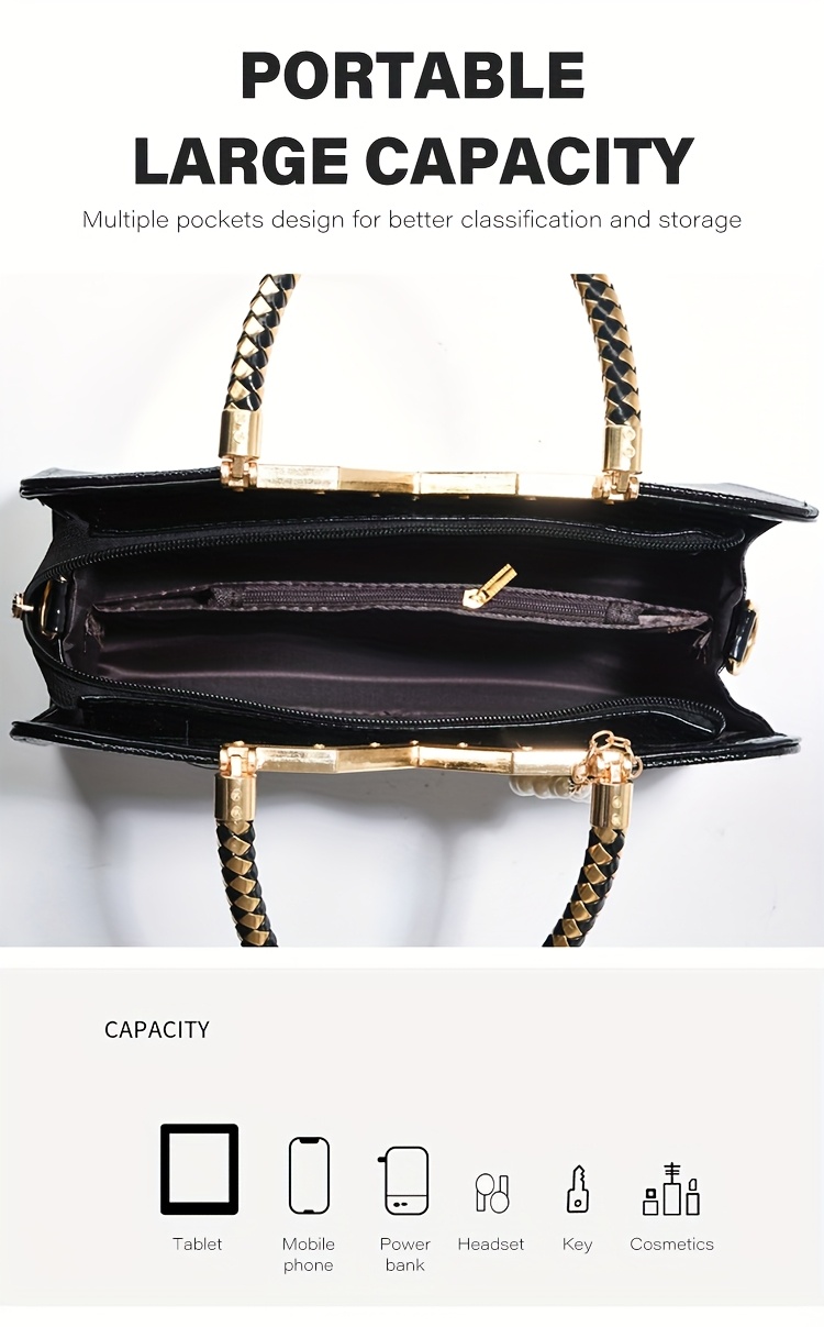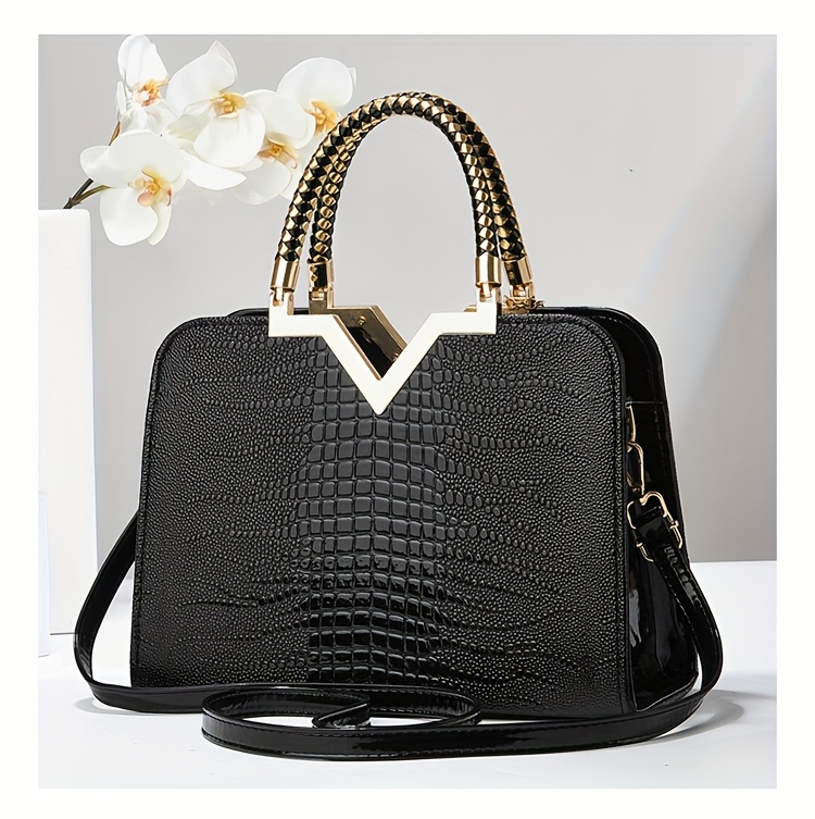 [Stylish Crocodile Bag] Stylish Crocodile Texture Eonothem Women's Handbag | Black Polyester Multi-Compartment Shoulder Bag with Golden-Tone Hardware, Detachable Chain Strap, and Decorative Charm - Perfect for Everyday Use or